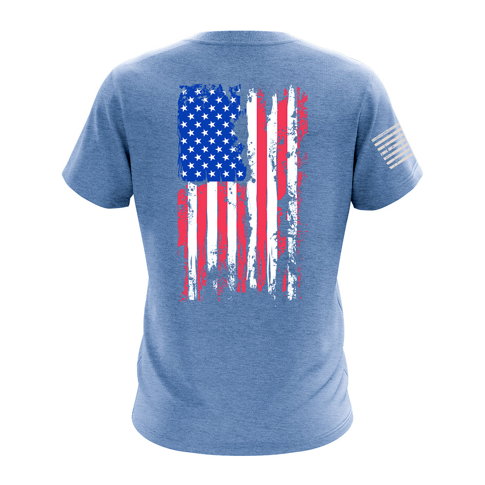 A distressed and battle tested flag drapes vertically down the back of this shirt.