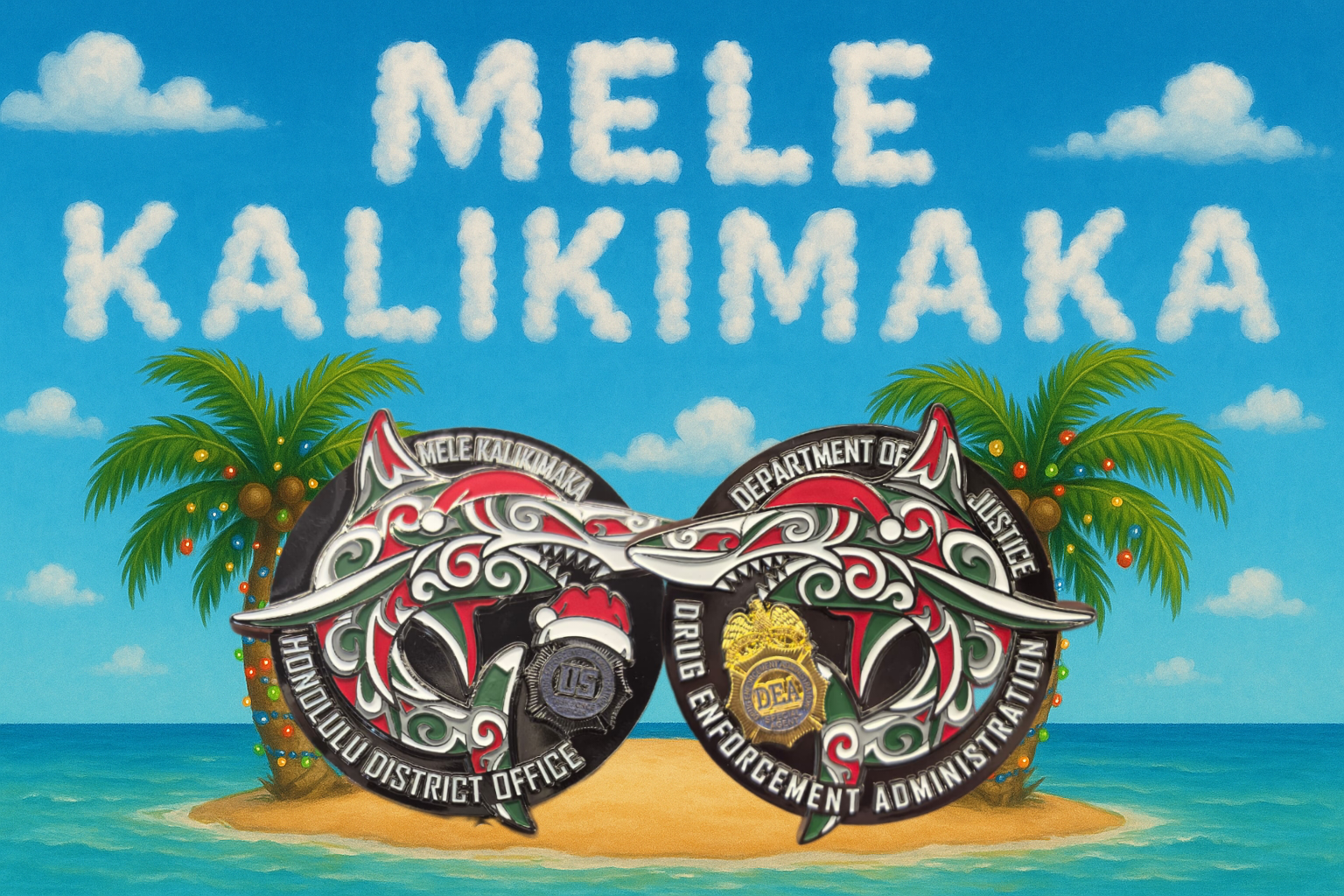 These large 2.25" inch coins represent the Drug Enforcement Administration's HONOLULU DISTRICT OFFICE. The sharks are ready to celebrate the holidays with the traditional Hawaiian Christmas greeting, Mele Kalikimaka. At the office's request their coins were reimagined for the holidays.
