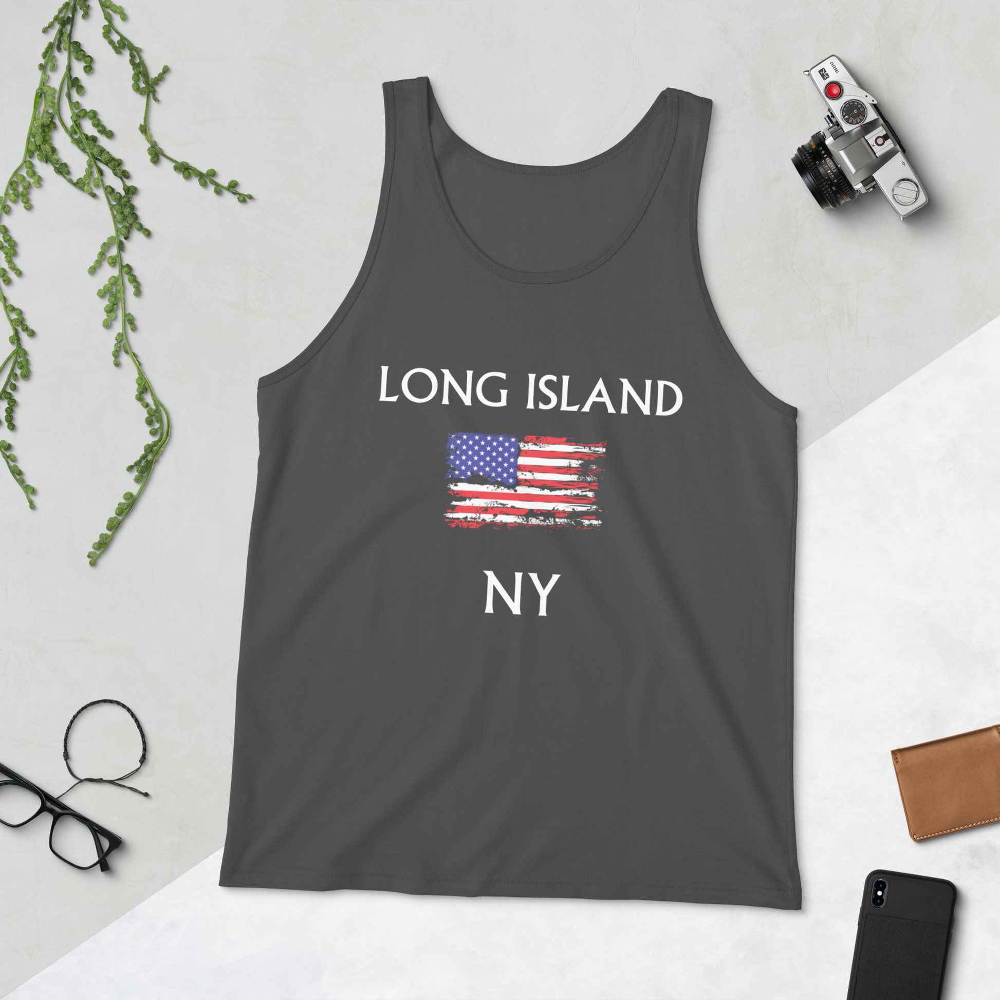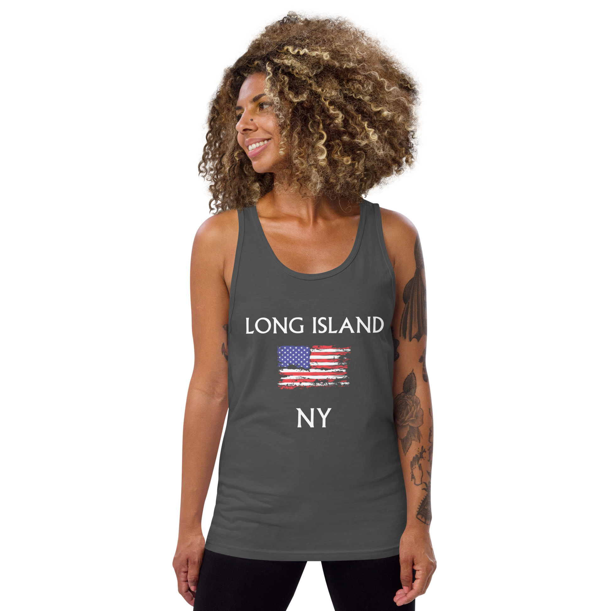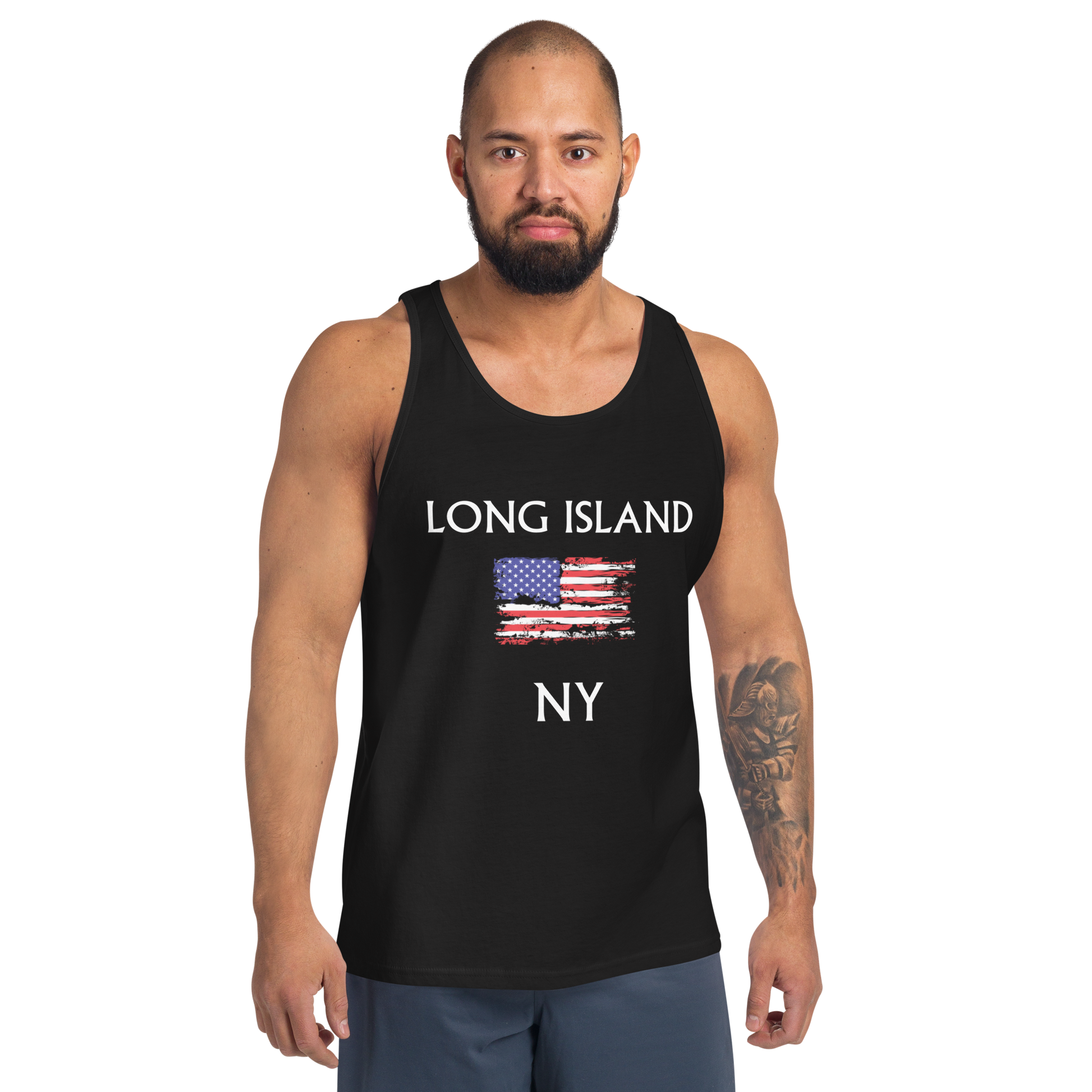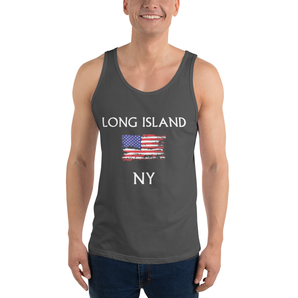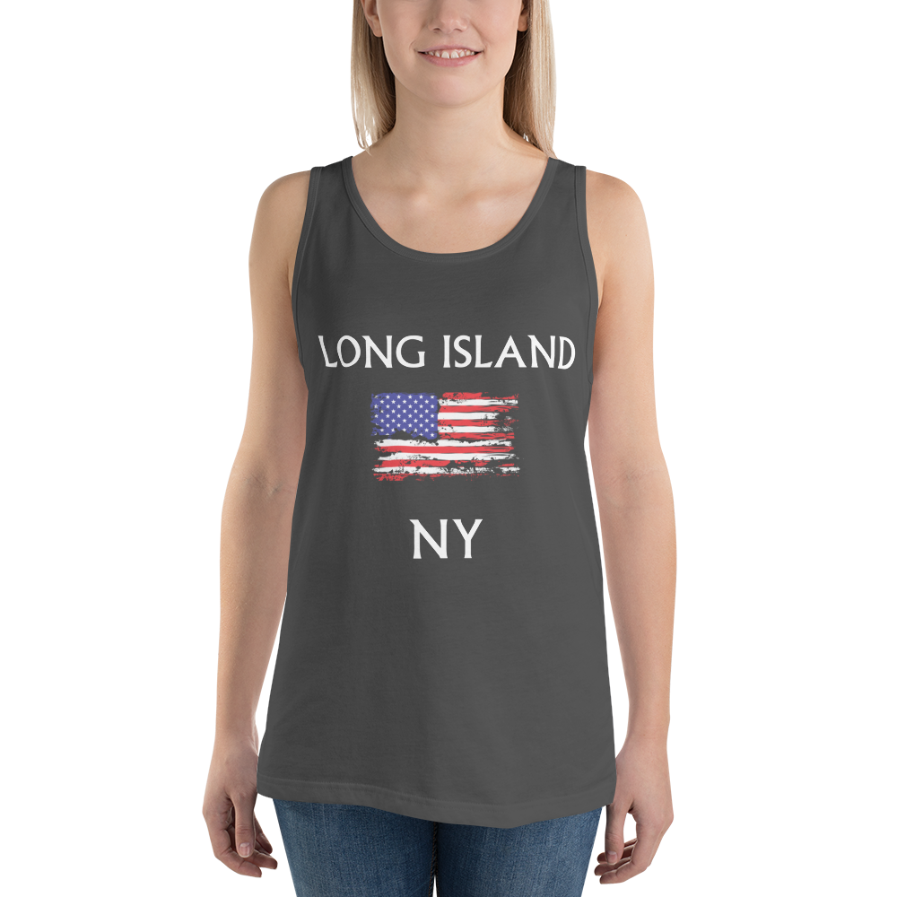 Let everyone know that you live ON Long Island with a classic, staple tank top, displaying a distressed American Flag. A timeless classic intended for anyone looking for great quality and softness.