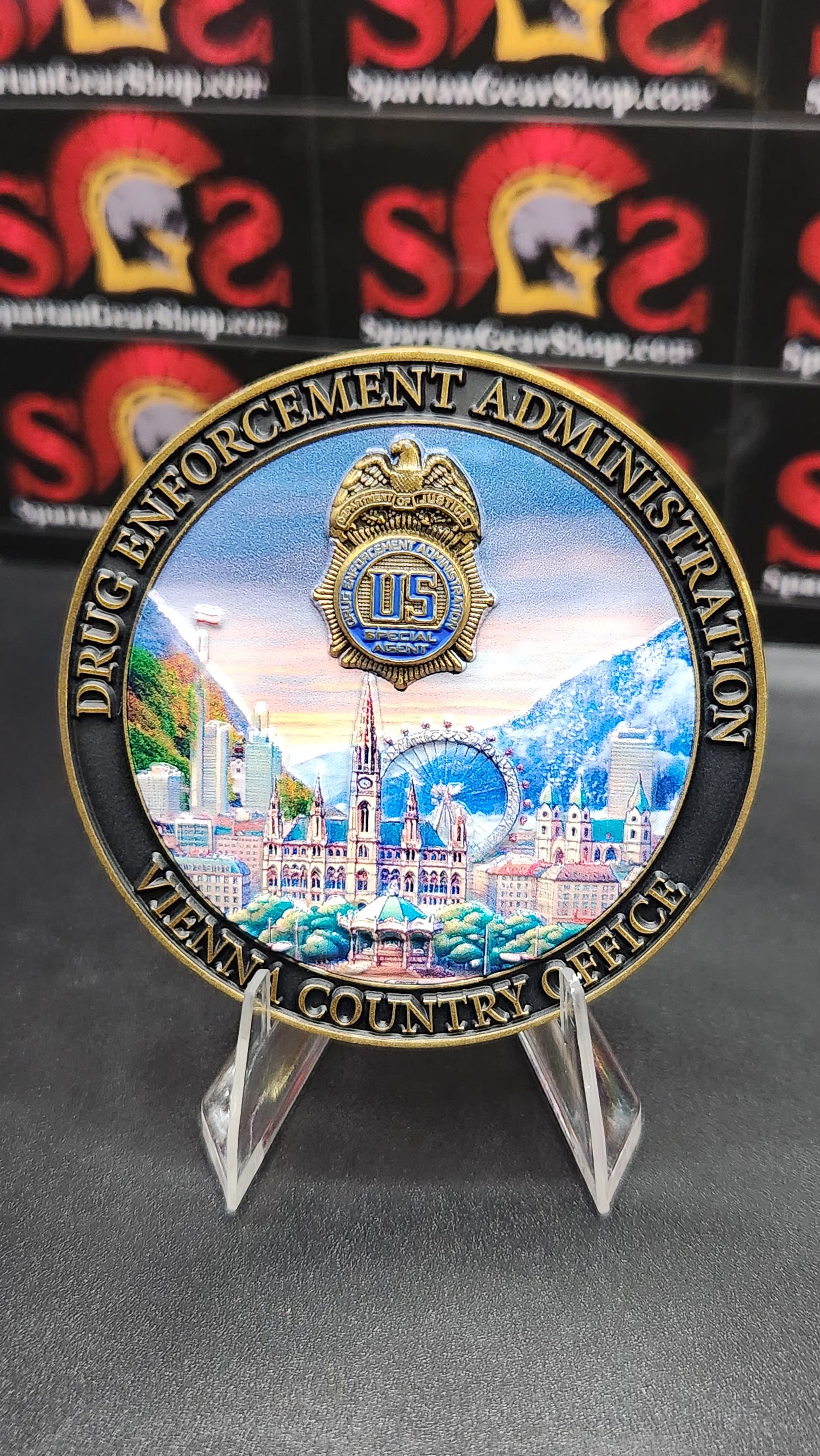 These large 2.25" coins represent the Drug Enforcement Administration's VIENNA AUSTRIA OFFICE. Officially commissioned by this office. These coins display a MISSPELLED AUSTRIA "AUSTIRA" after having 3 art concepts and 2 mold concepts approved. Mistakes happen.