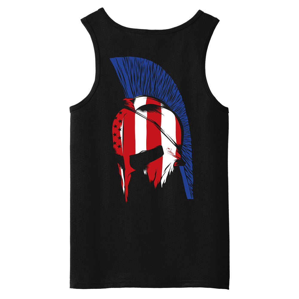 Fight like a Spartan. Fill color Red White and Blue, battle tested signature Spartan on one side and a full color American flag on the reverse.